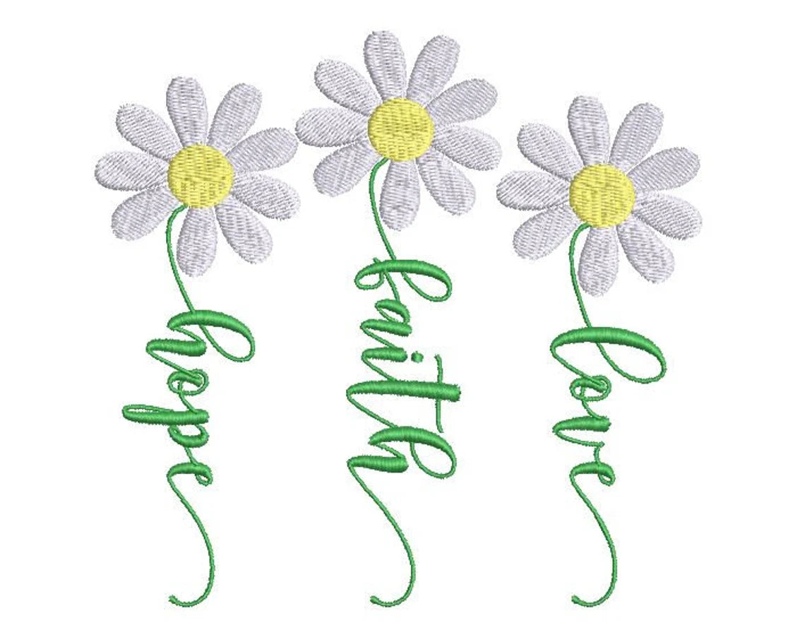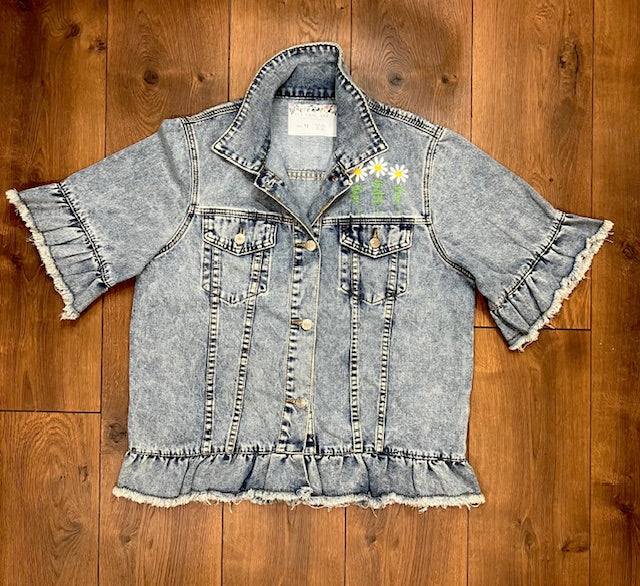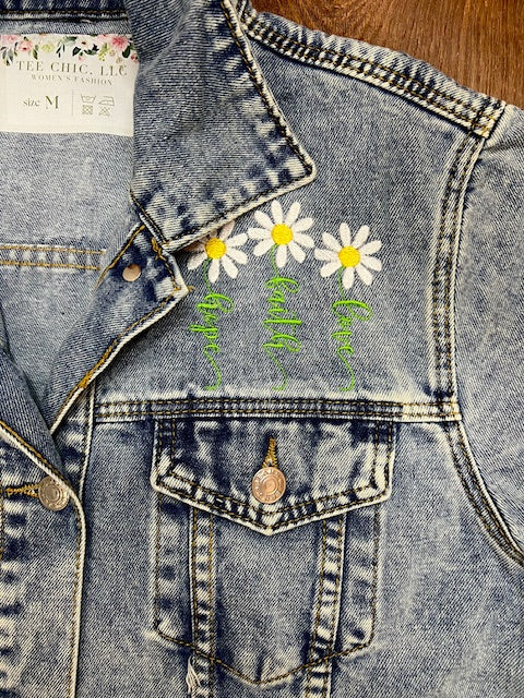 3/4 sleeve Denim Jacket w/ Faith Hope Love Daisies pocket embroidery design