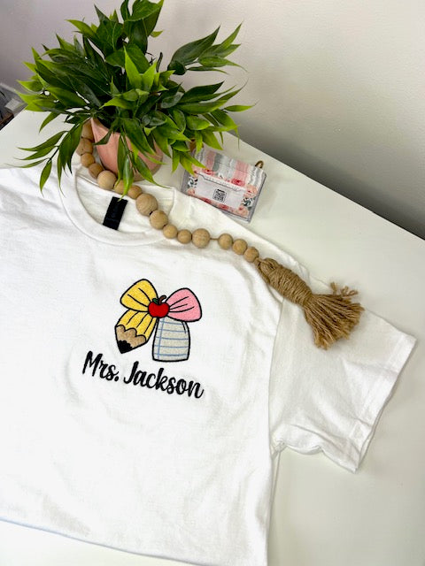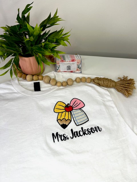 🍎Teacher Embroidery Shirt with Pencil Bow Apple Note Design 🍎