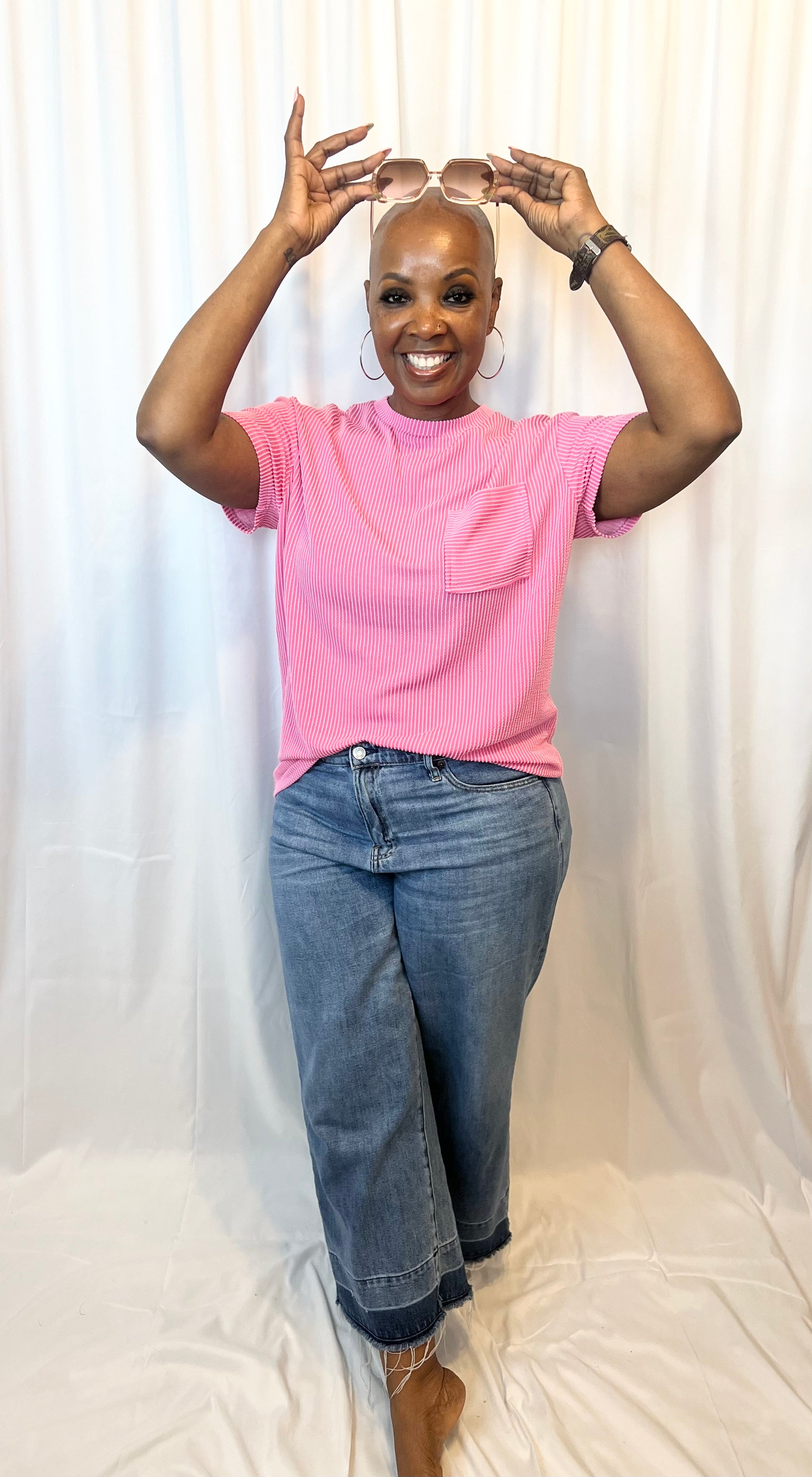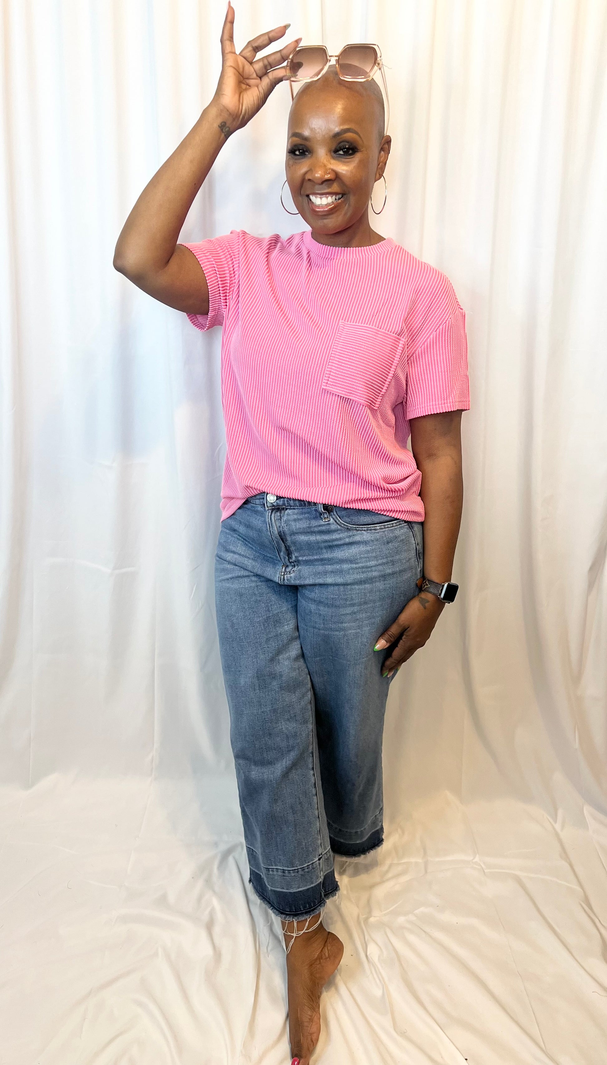 Pink Corded Knit Pocketed Loose Fit T Shirt