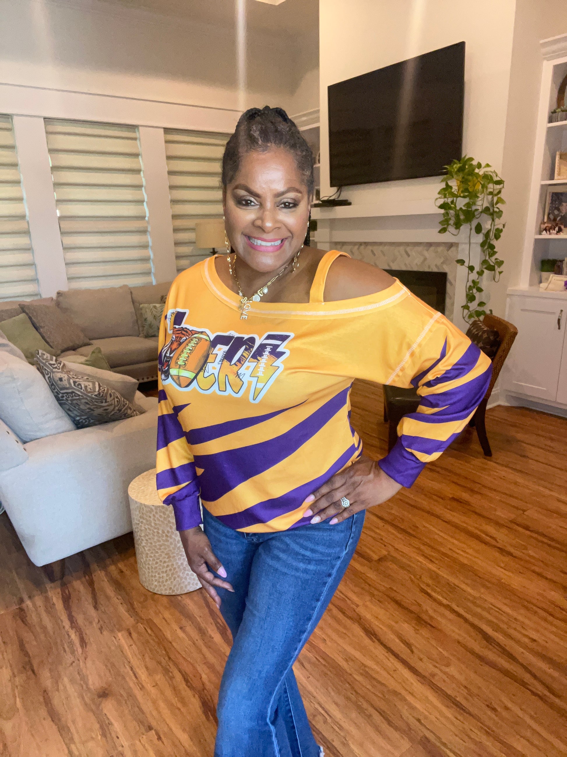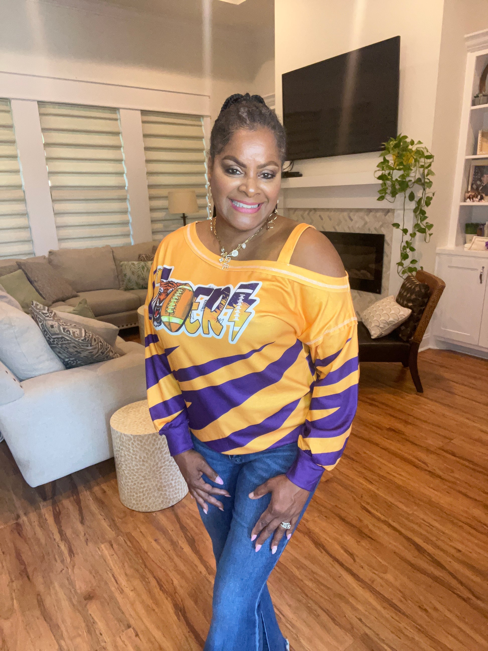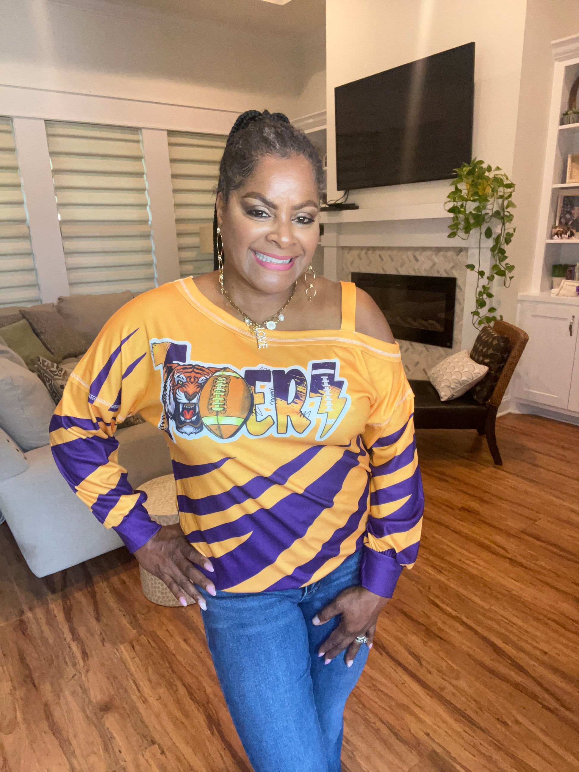 The blouse boasts a bold tiger, rugby football and striped print for a fierce look.
